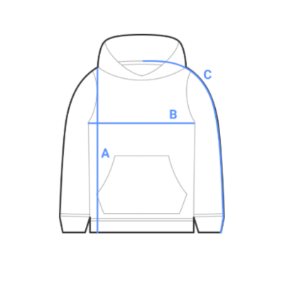 | Tamanho | Comprimento (A) | Largura (B) | Meio do Peito (½B) | Manga (C) |